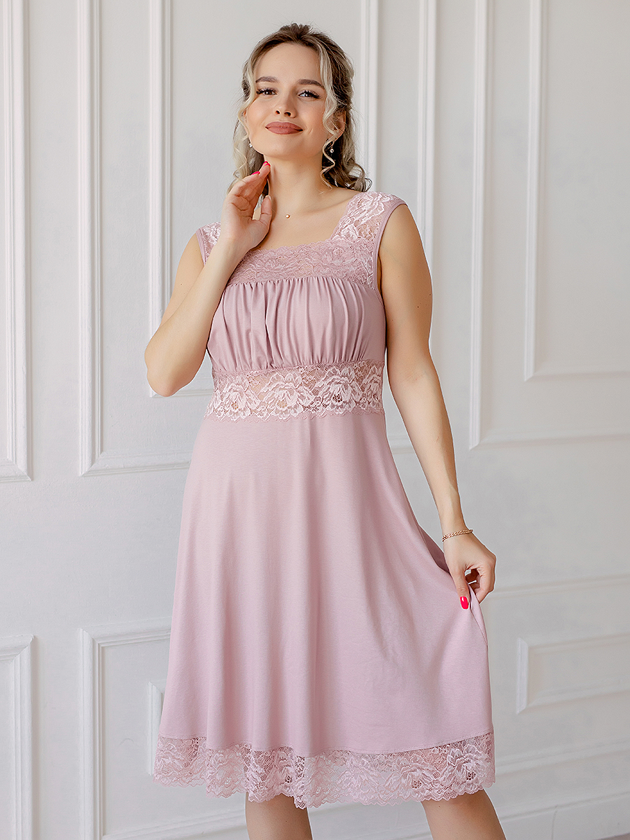 Сорочка прямого силуэта, расклешенная к низу от груди, длиной до колена, на широких кружевных бретелях. На детали переда выполнена двойная кокетка, верхняя кокетка задрапирована. Благодаря двойной кокетке и драпировке, очень хорошо поддерживает грудь.Сорочка декорирована эластичным кружевом под кокеткой, по горловине, проймам и низу. Проймы окантованы.